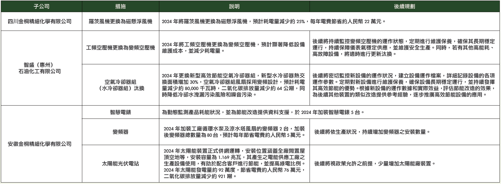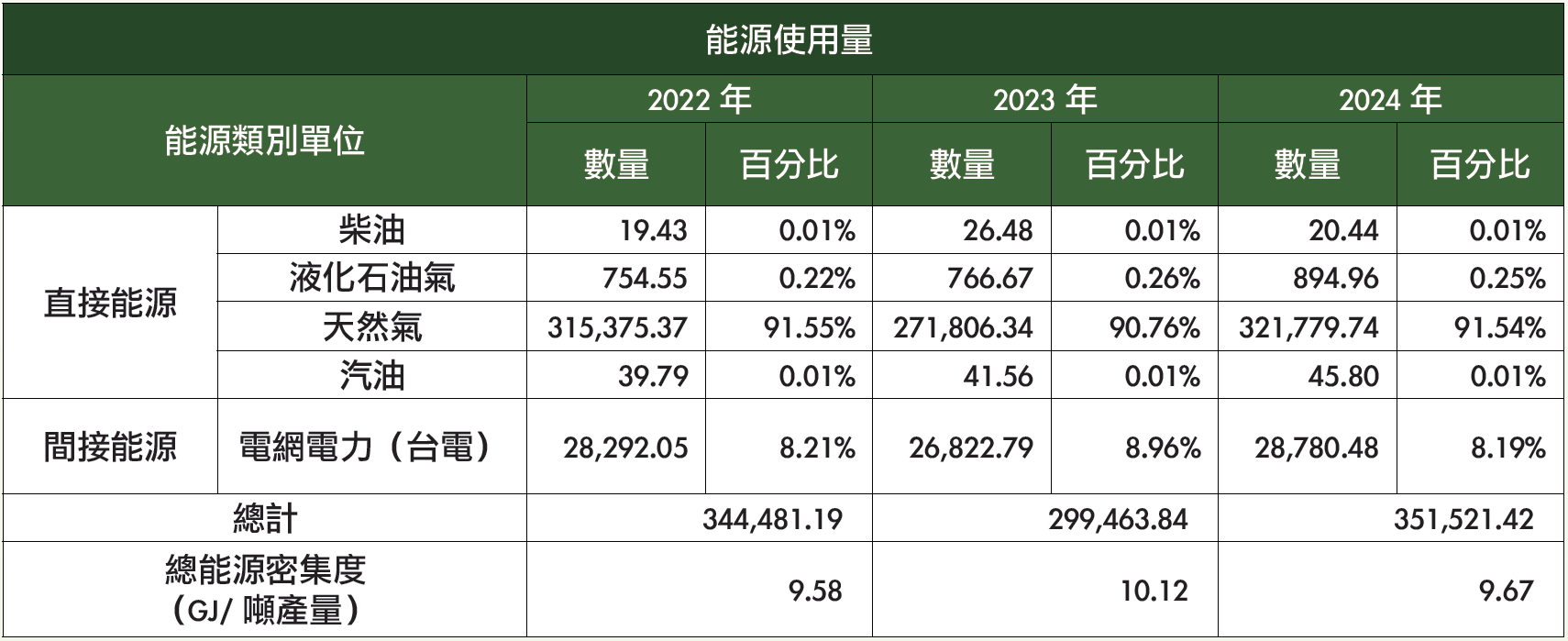 2024年和桐化學總能耗為351,521.42 GJ,較去年度增加17.38%,而本年度能源密集度為9.67 GJ/噸產量,較去年度下降4.45%,主係2023年產品產量較低,且2023年上游原料油品調整原油比例,致產品品質效率較低。