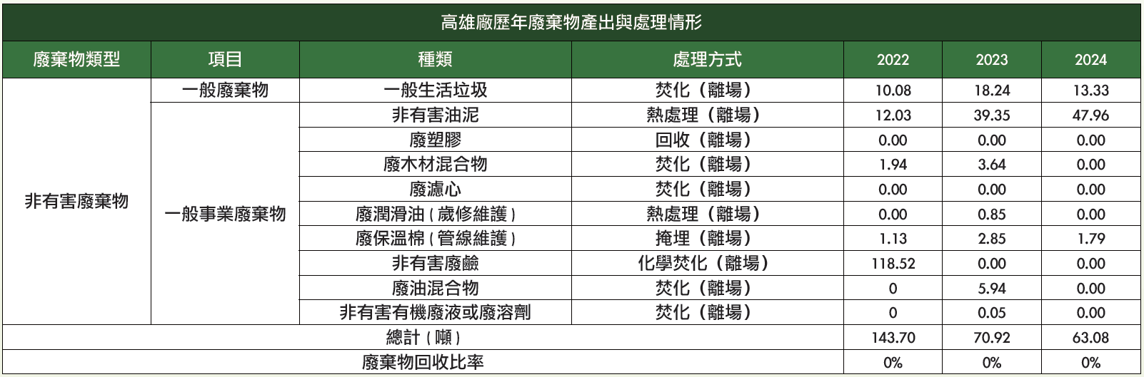 和桐化學廢棄物主要分為一般事業廢棄物與生活垃圾,於生產過程中並未產生有害廢棄物。2024年高雄廠共產生約63.08噸廢棄物,相較於2023年下降約11%,其中非有害油泥占比為76%。2024年無發生違反廢棄物清理法之事件。