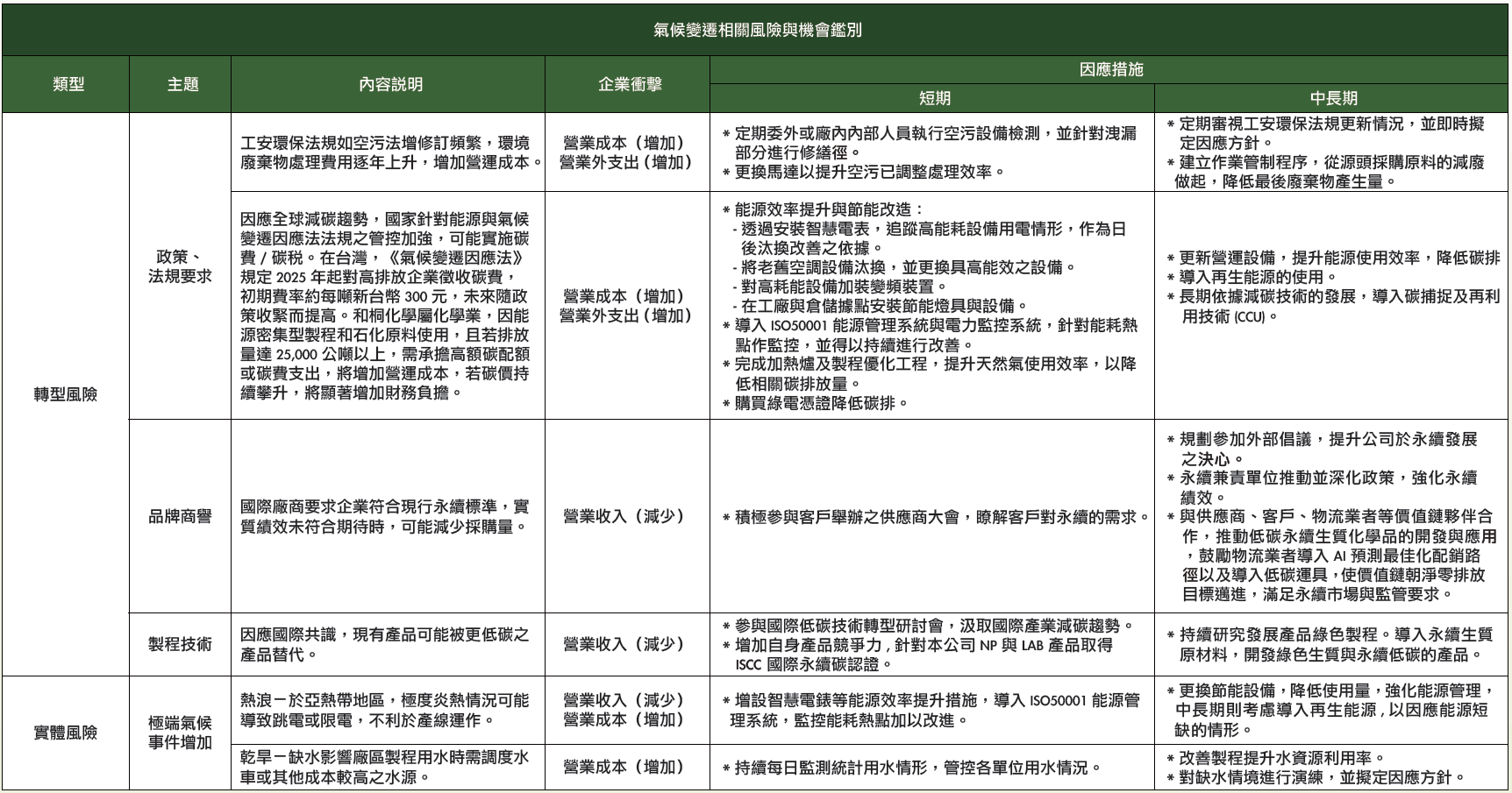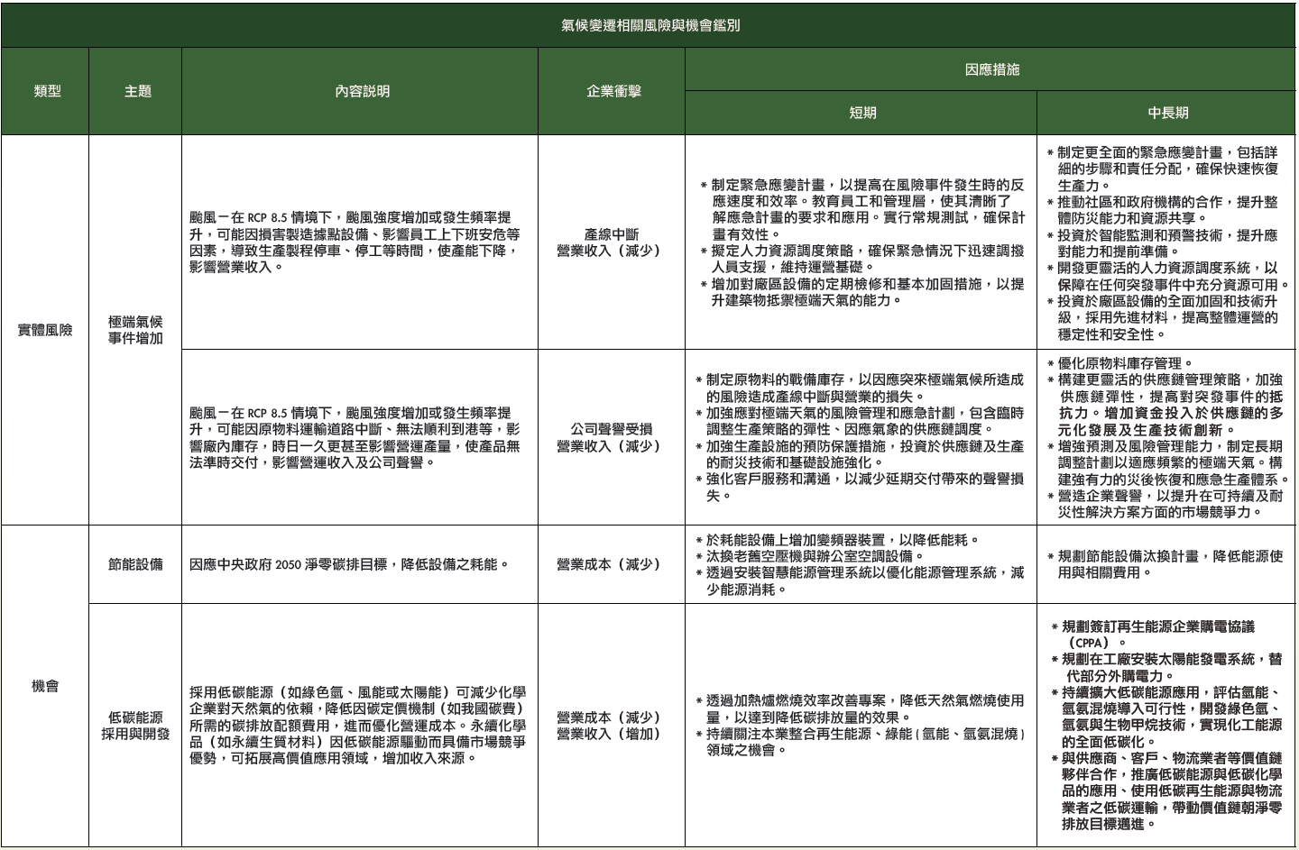 為透明揭露氣候變遷相關的風險與機會,使各利害關係人瞭解氣候變遷對營運的影響,故依「氣候相關財務揭露建議書」(Recommendation of the Task Force on Climate-related Financial Disclosure,TCFD)指引框架,按治理、策略、風險管理及指標與目標四大架構,盤點、鑑別及揭露氣候變遷議題,並依據其鑑別與評估結果制定各項管理程序與因應策略,進而降低環境風險對營運的負面衝擊。
