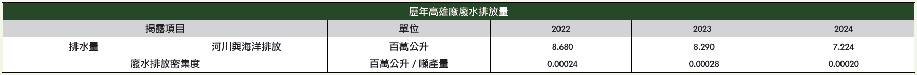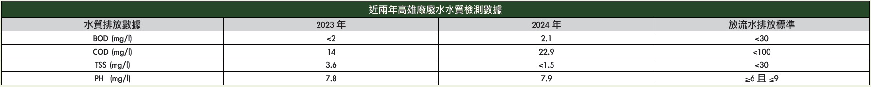 註2:本廠廢水排放量依據水錶量測,類別屬於淡水(>1,000 mg /L 總溶解固體),廢水無被其他組織使用之情況,依據世界資源研究所開發之水資源風險分析工具指出,台灣非屬全球水資源壓力地區。