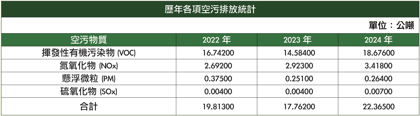 為有效降低VOC排放量,高雄廠儲槽於2024年開始裝設VOC冷凝回收系統,於2025年第二季試俥,預計於2025年第三季啟用,將有效降低空污VOC排放量。預期系統啟用後可有效收集儲槽VOC廢氣,使VOC排放量下降約33%,預計減量5.6噸。