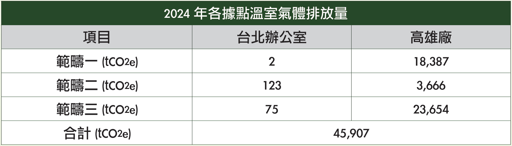 註1:上表基準年與揭露範疇與公開資訊觀測站申報資料不同。公開資訊觀測站之申報基準年訂為2022年,揭露範疇僅涵蓋母公司-台北辦公室及高雄廠;