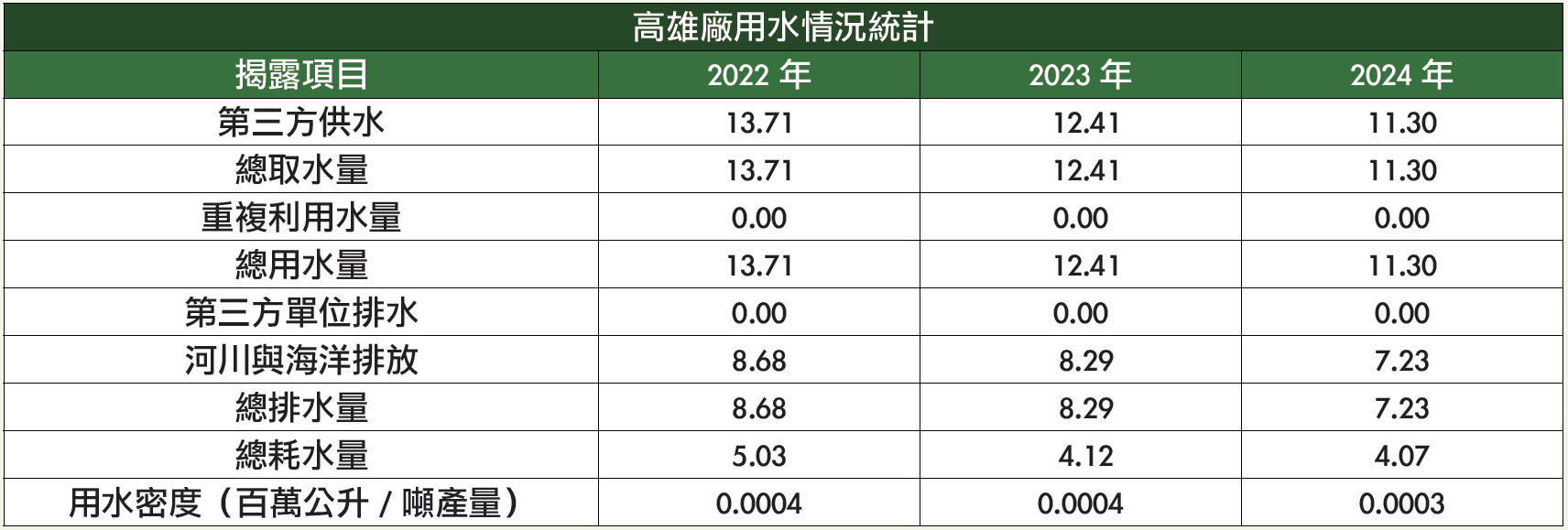 高雄廠於2024年度總計用水11.30百萬公升,與2023年相比下降8.9%,單位產量用水密度為0.0003(百萬公升/噸產量),未來和桐化學將持續努力提升用水效率,避免水資源浪費。