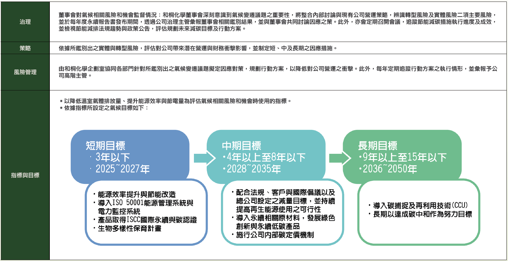 未來將持續深化氣候變遷相關主題風險的辨識流程與做法,並加強分析其對營運的短、中、長期造成的影響,提早制定因應措施以降低未來衝擊,強化利害關係人對和桐化學永續經營的信心。