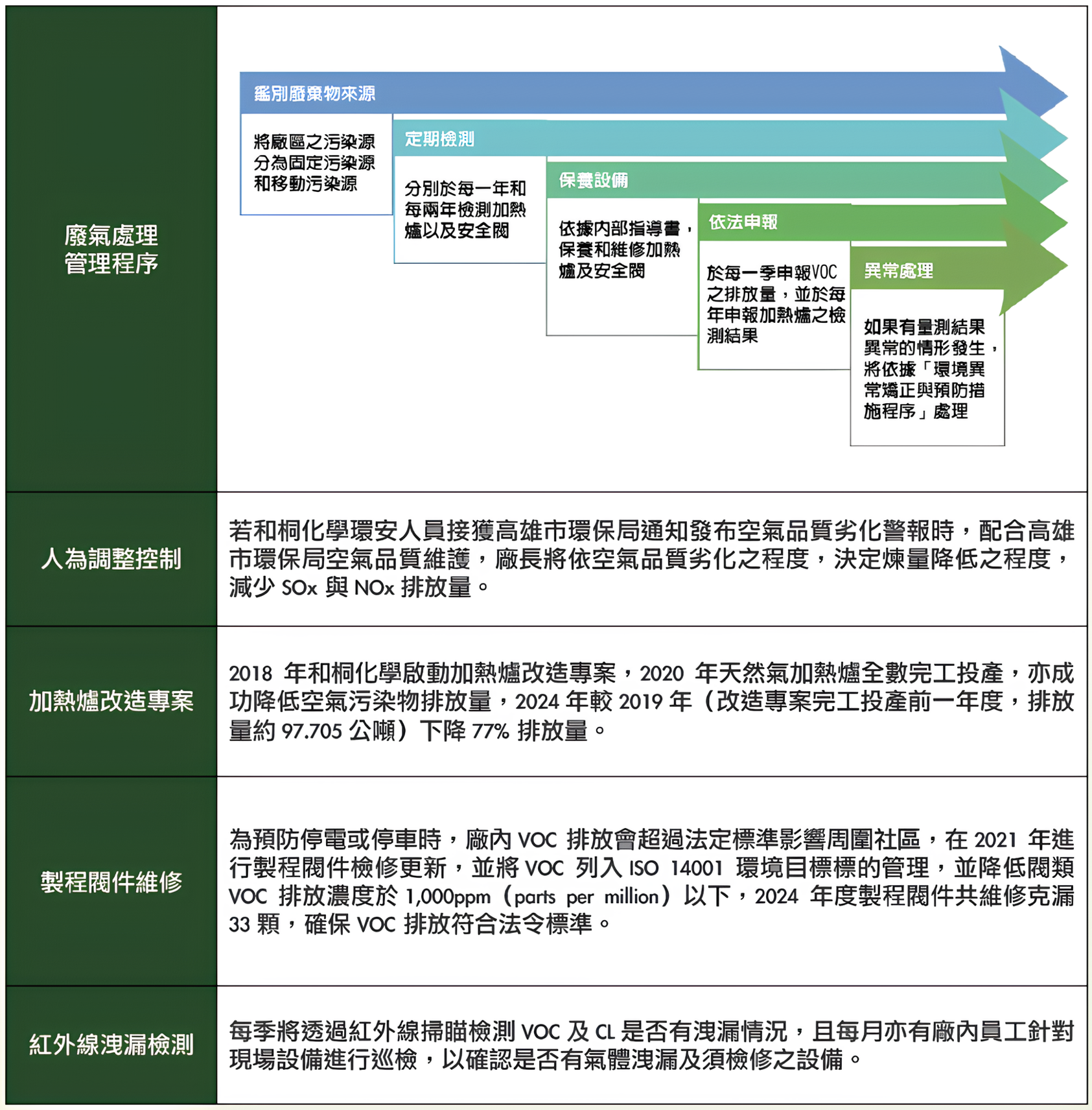 由於和桐化學產業特性,以石化燃料為原料,故於產品製造過程中常會排放空氣污染物,為確保社區居民的福祉並降低環境污染,自上制定「廢氣處理管理程序」評估並管理對社會與環境產生之衝擊,並執行下列空氣污染防制管理措施,以降低、預防對當地社區的居民健康與環境之影響。