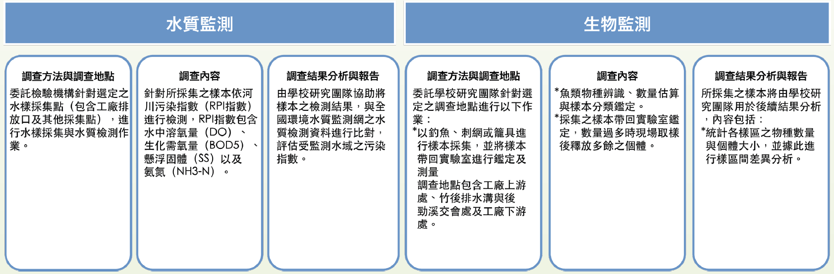 此計畫預定針對後勁溪上游至中游河段實施水質與生物監測作業,兩項監測將同步進行,調查頻率為每兩個月一次,為期一年,預計共進行六次。水質監測與生物監測之具體計畫內容如下: