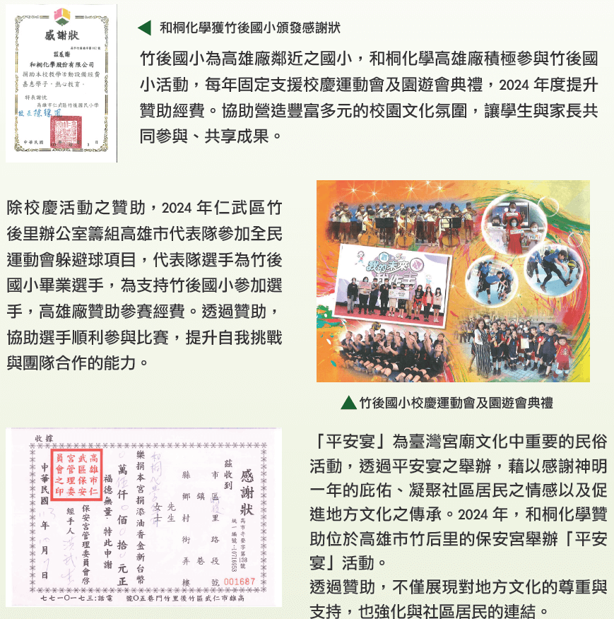社區的繁榮是和桐化學立足的根基,因此本公司積極投入與鄰里社區之交流,長期關心社區發展情形。2024年,除持續拜訪地下管線經過敏感受體、贊助竹後國小校內與校外活動,也贊助保安宮平安宴活動,期望透過這些行動,強化本公司與社區的連結。
